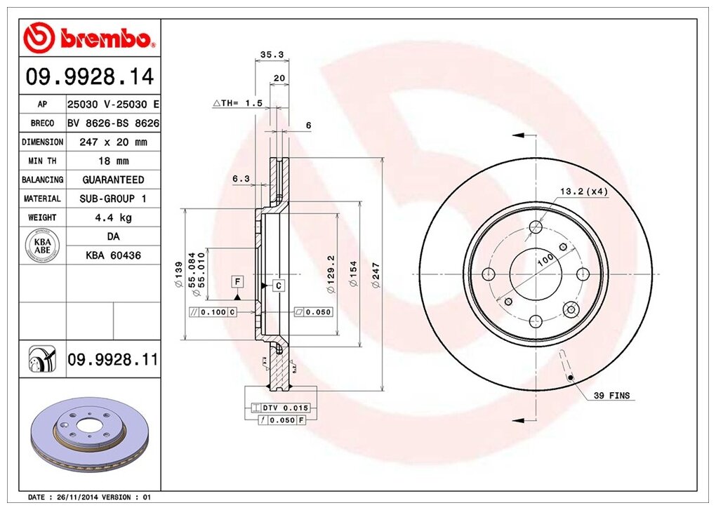 Brake front brembo 09.9928.14 247x20 for Citroen C1, Peugeot 107, Peugeot 108, Toyota Aygo