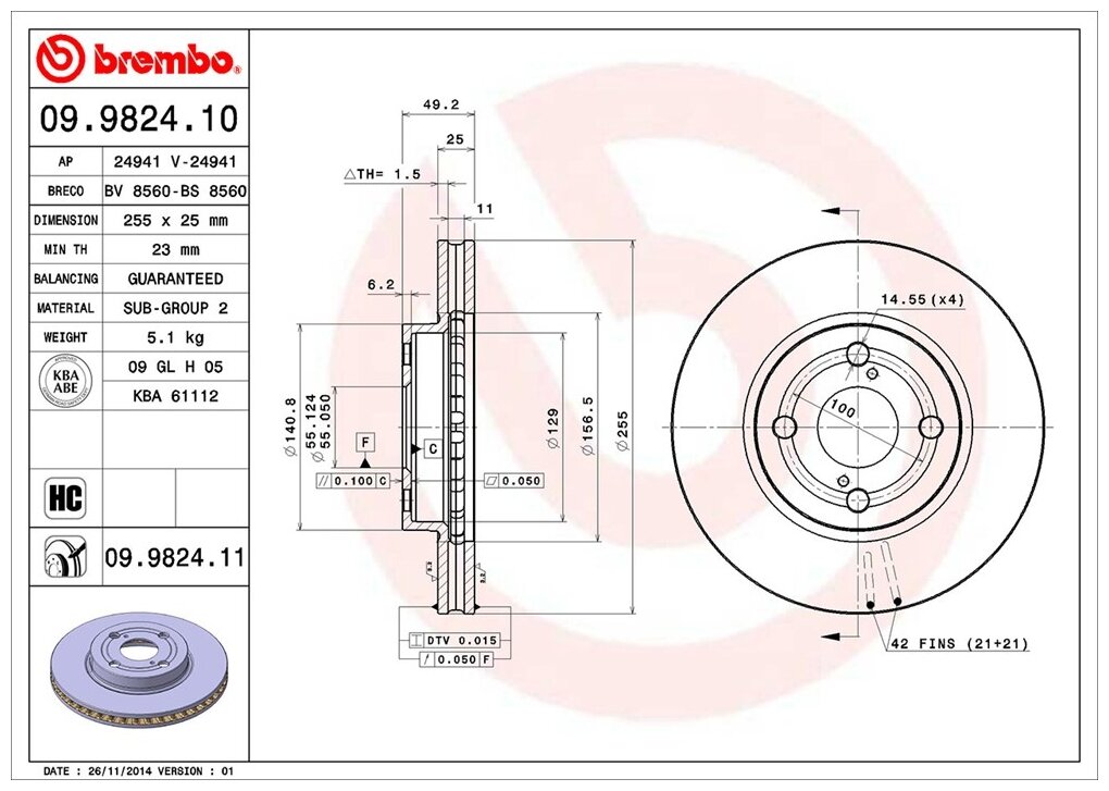 Mounting bridge: front, front, disc diameter: 255 mm, center hole diameter: 55 mm, number of mounting holes: 4, hole diameter: 100 mm, thread diameter: 14.55 mm, center diameter: 140.8
