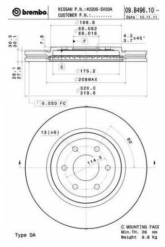 Mounting bridge: front, disc diameter: 320 mm, center hole diameter: 68 mm, number of fixing holes: 6, hole diameter: 114.30 mm, thread diameter: 13 mm, center part diameter: 186.80 mm, thickness