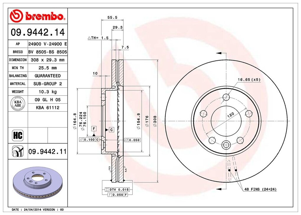 Brake front brembo 09.9442.14 308x29.3 for Volkswagen Multivan, Volkswagen Touareg, Volkswagen Transporter