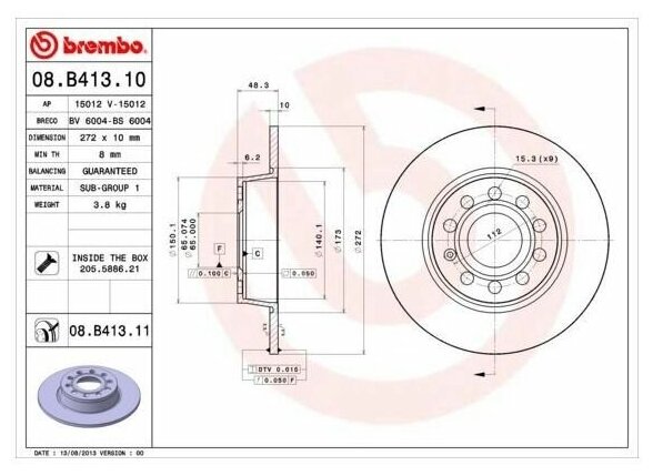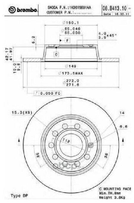 Mounting bridge: rear, disc diameter: 272 mm, center hole diameter: 65 mm, number of mounting holes: 5, disc thickness: 10 mm, minimum disc thickness: 8 mm, thickness: 10 mm, corresponding OE codes: AUDI 1K0615601AA
