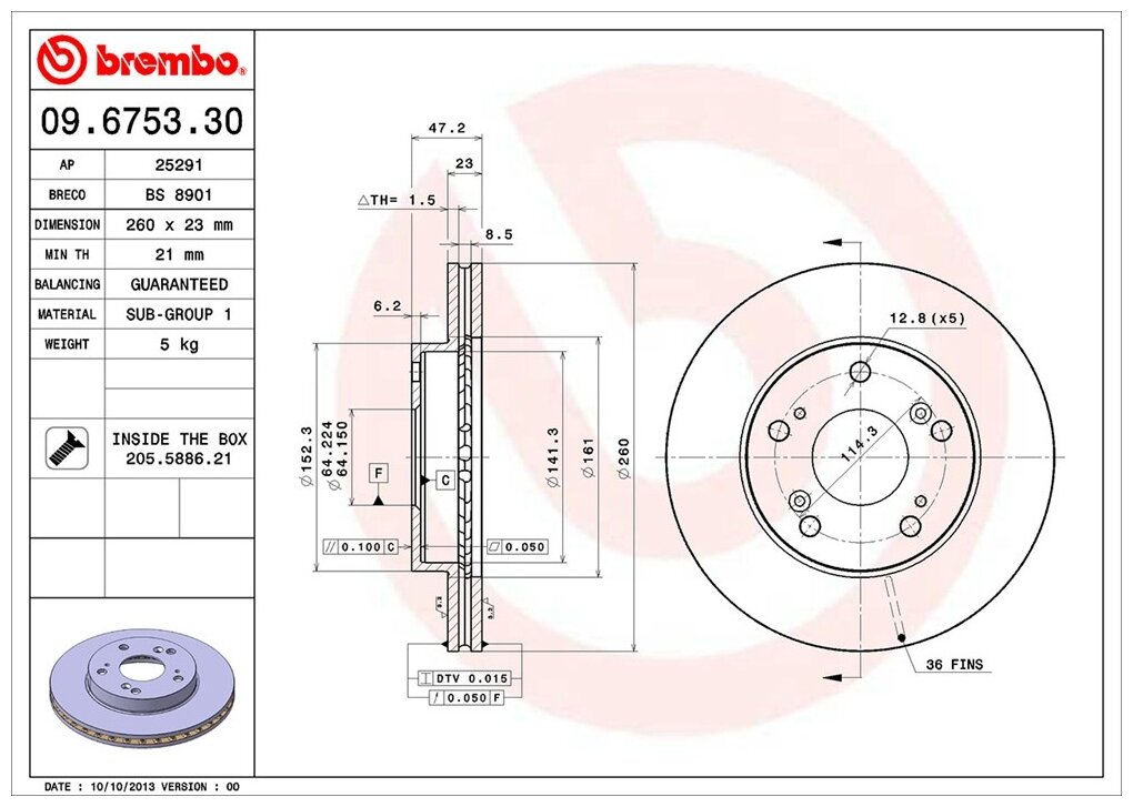 Mounting bridge: front, disc diameter: 260mm, center hole diameter: 64.20mm, number of mounting holes: 5, hole pattern diameter: 114.30mm, thread diameter: 12.80mm, center part diameter: 152.30mm, then