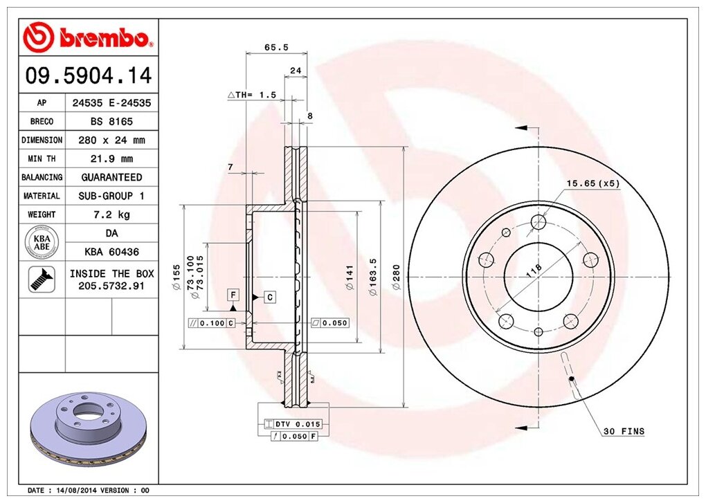 Brake front brembo 09.5904.14 280x24 for Citroen Jumper, Fiat Ducato