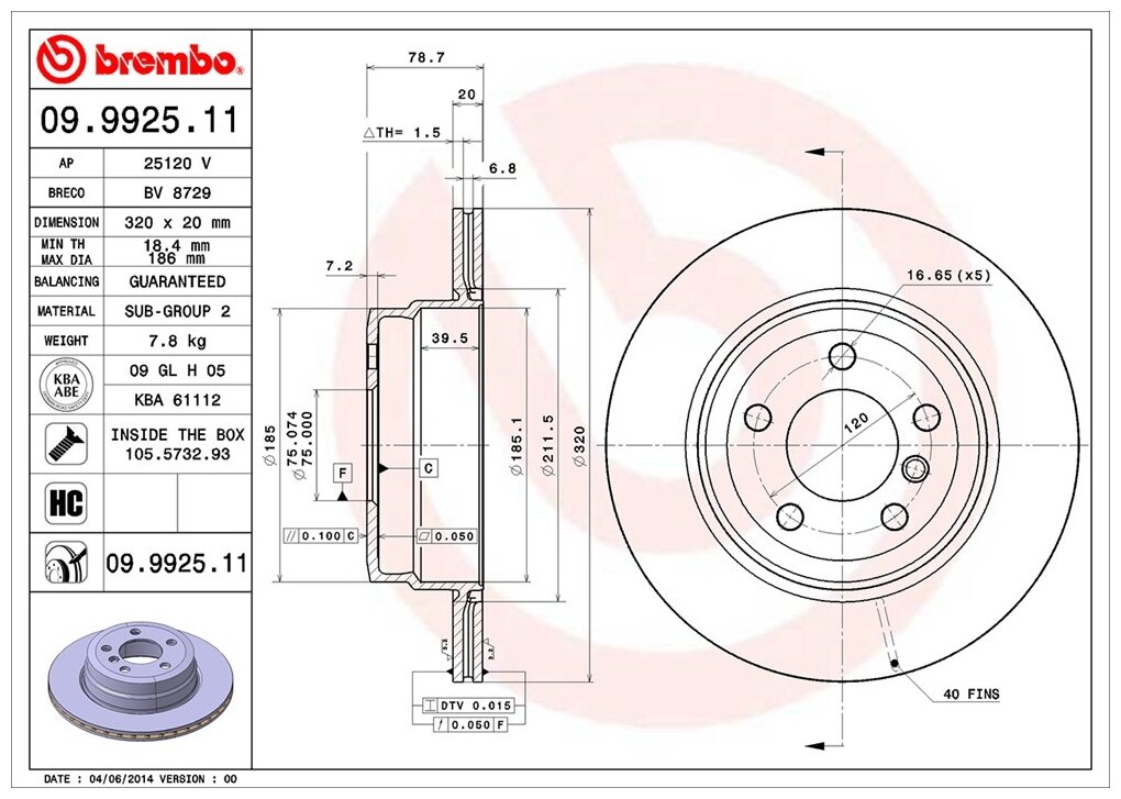 Brake rear brembo 09.9925.11 320x20 for BMW X5, BMW X6