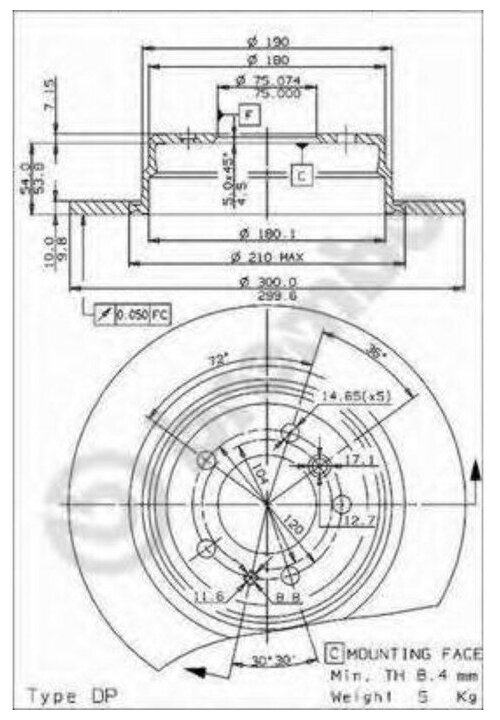 Installation bridge: rear, disc diameter: 300 mm, center hole diameter: 75 mm, number of fixing holes: 5, hole diameter: 120 mm, thread diameter: 14.65 mm, central part diameter: 180 mm, thickness d