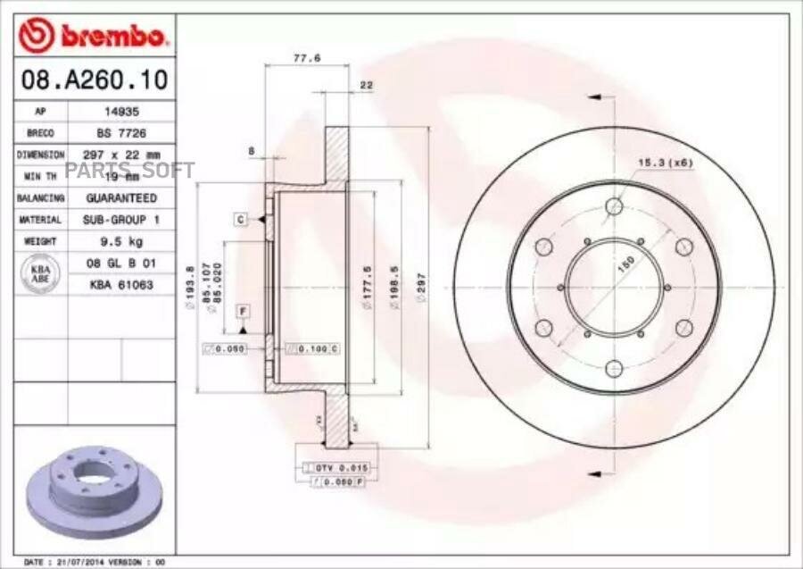 Brake front brembo 08.A260.10 297x22 for Iveco Daily