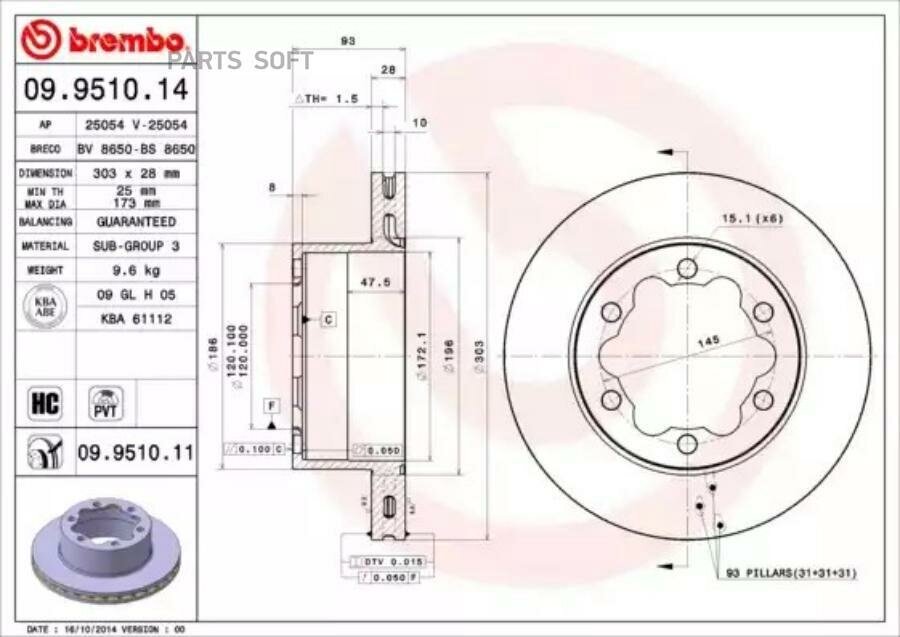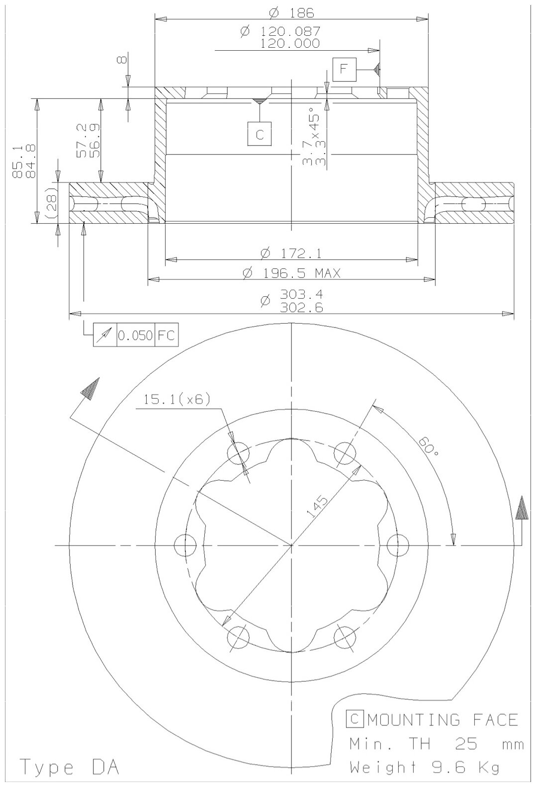 Installation bridge: rear, disc diameter: 303 mm, center hole diameter: 120 mm, number of mounting holes: 6, disc thickness: 28 mm, minimum disc thickness: 25 mm, thickness: 28 mm, internal ventilation, conform