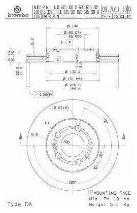 Mounting bridge: front, disc diameter: 256 mm, center hole diameter: 65 mm, number of mounting holes: 5, disc thickness: 22 mm, minimum disc thickness: 19 mm, thickness: 22 mm, internal ventilation