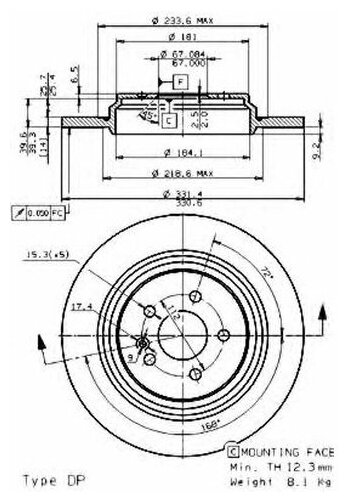 Mounting bridge: rear, disc diameter: 331 mm, center hole diameter: 67 mm, number of fixing holes: 5, disc thickness: 14 mm, minimum disc thickness: 12.30 mm, thickness: 14 mm