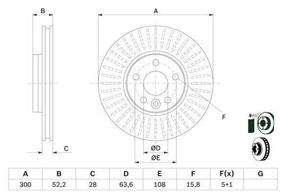 Mounting bridge: front, disc diameter: 296 mm, center hole diameter: 62 mm, number of fixing holes: 5, hole pattern diameter: 114.30 mm, center part diameter: 155 mm, disc thickness: 28 mm, min.