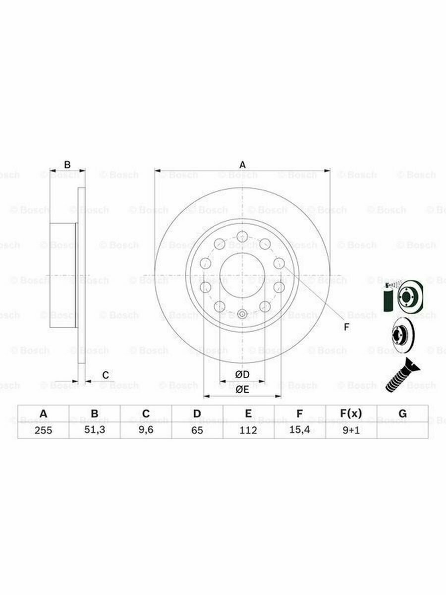 Mounting bridge: rear, disc diameter: 255 mm, center hole diameter: 65 mm, number of fixing holes: 10, hole diameter: 112 mm, disc thickness: 9.60 mm, minimum disc thickness: 7 mm, thickness: 9.60
