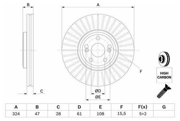Mounting bridge: front, disc diameter: 324 mm, center hole diameter: 61 mm, number of mounting holes: 5, disc thickness: 28 mm, minimum disc thickness: 25.41 mm, thickness: 28 mm, internal ventilation
