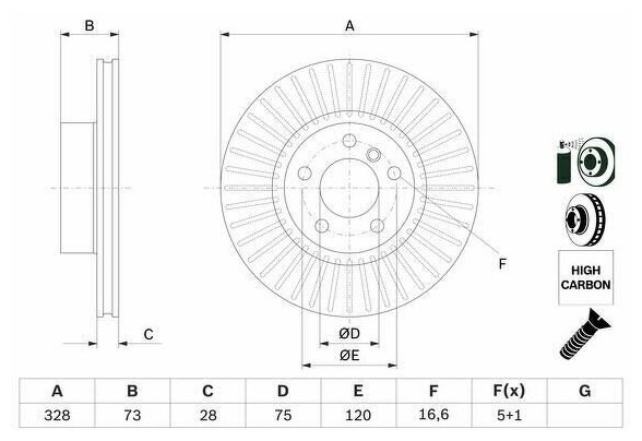Mounting bridge: front, disc diameter: 328 mm, center hole diameter: 75 mm, number of mounting holes: 5, disc thickness: 28 mm, minimum disc thickness: 26.40 mm, thickness: 28 mm, internal ventilation