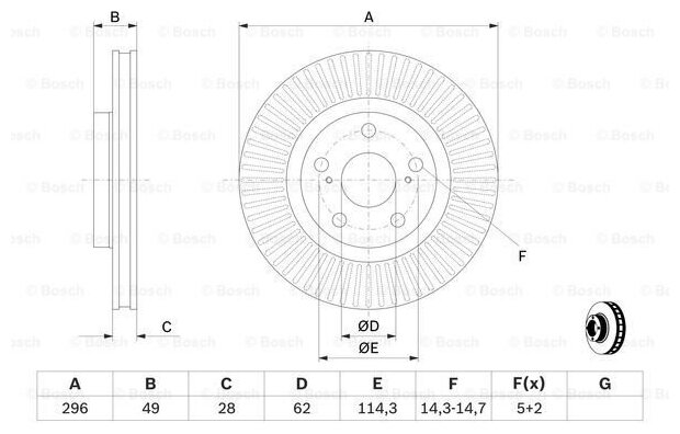 Mounting bridge: front, front, disc diameter: 296 mm, center hole diameter: 62.08 mm, number of mounting holes: 5, disc thickness: 28.20 mm, thickness: 28.20 mm, internal ventilation