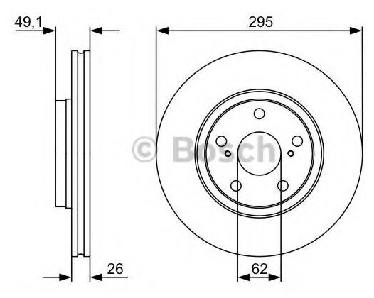Installation bridge: front, disc diameter: 295 mm, center hole diameter: 62 mm, number of mounting holes: 5, disc thickness: 26 mm, minimum disc thickness: 23 mm, thickness: 26 mm, internal ventilation