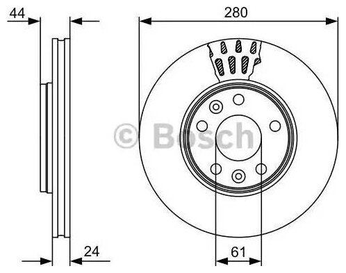 Mounting bridge: front, disc diameter: 280 mm, center hole diameter: 61 mm, number of mounting holes: 5, disc thickness: 24 mm, minimum disc thickness: 21.80 mm, thickness: 24 mm, internal ventilation, acc.
