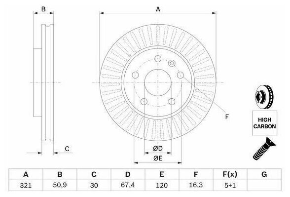 Mounting bridge: front, disc diameter: 321 mm, center hole diameter: 67.40 mm, number of mounting holes: 5, disc thickness: 30 mm, minimum disc thickness: 27 mm, thickness: 30 mm, internal ventilation