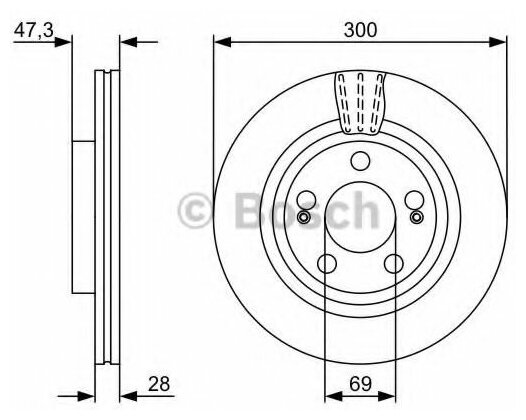 Mounting bridge: front, disc diameter: 300 mm, center hole diameter: 69 mm, number of mounting holes: 5, disc thickness: 28 mm, minimum disc thickness: 26.40 mm, thickness: 28 mm, internal ventilation