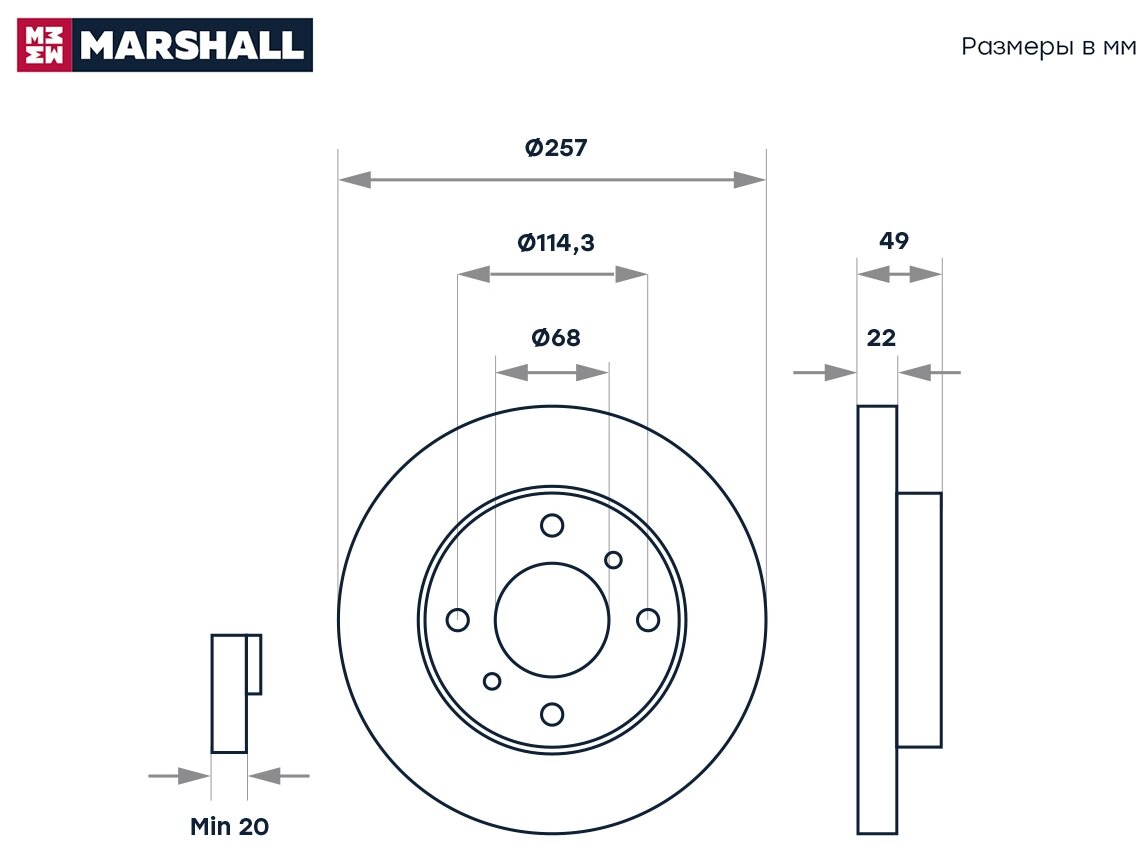 Mounting bridge: front, front, disc diameter: 257 mm, center hole diameter: 68 mm, number of mounting holes: 4, hole diameter: 114.30 mm, thread diameter: 12.50 mm, disc thickness: 22 mm, minimum