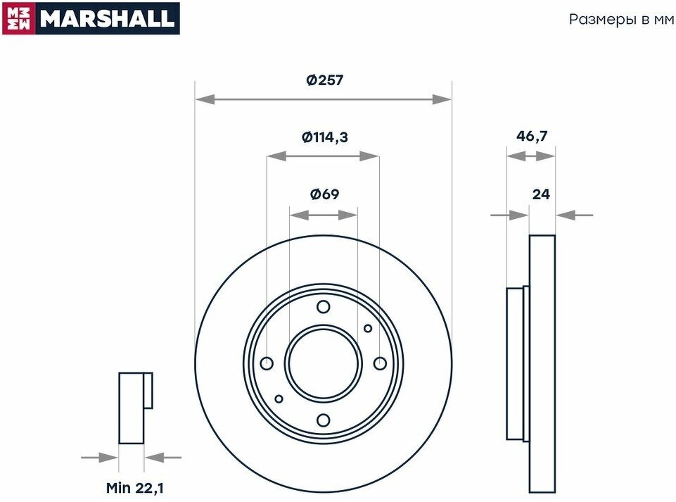 Mounting bridge: front, disc diameter: 257 mm, center hole diameter: 69 mm, number of fixing holes: 4, hole pattern diameter: 114.30 mm, center part diameter: 152.60 mm, disc thickness: 24 mm, minimum