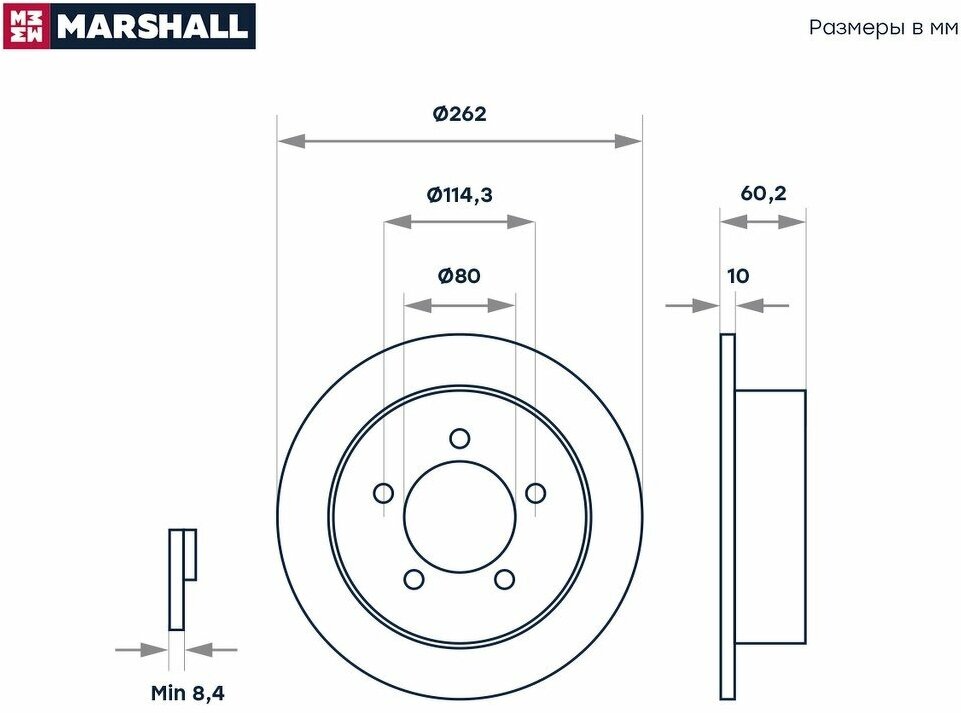 Installation bridge: rear, disc diameter: 262 mm, center hole diameter: 80 mm, number of mounting holes: 5, hole diameter: 114.30 mm, thread diameter: 12.60 mm, disc thickness: 10 mm, minimum thickness