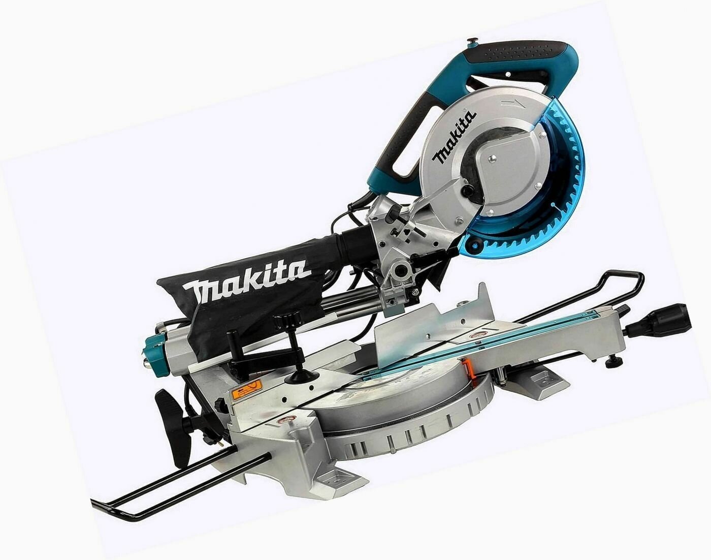 Miter saw, saw blade 216 mm, dust collector, adjusting triangle, miter wrench, hex wrench, screw clamp, holder, packaging