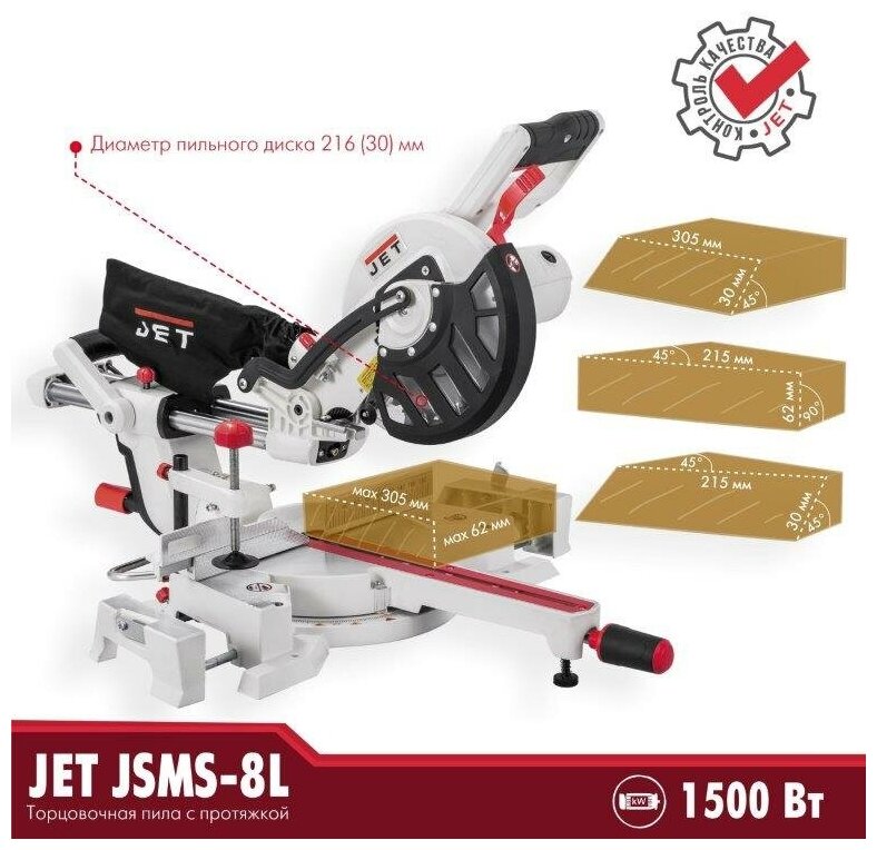 Type: miter saw, laser marker, disc diameter: 216 mm, Power W: 1500, cutting depth 90°: 62 mm, cutting width 90°: 305 mm, with pull, power supply: mains, functions: engine braking, design features: possibility