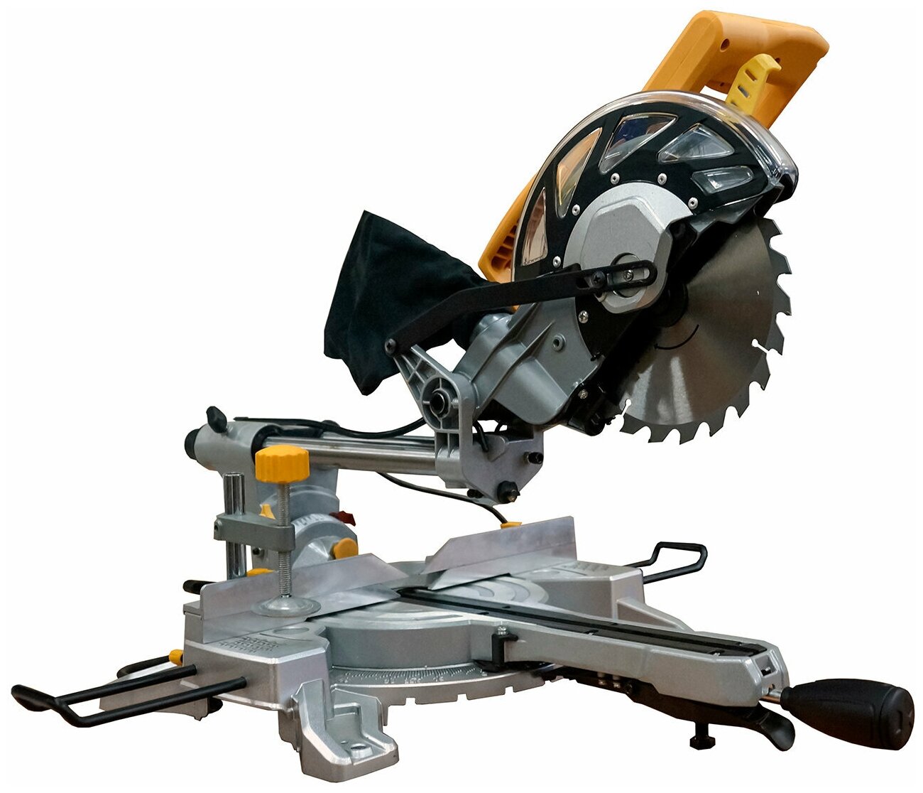 Miter saw - 1 pc., table extension - 2 pcs., clamp - 1 pc., dust bag - 1 pc., handle - 1 pc., hex key - 1 pc., carbon brush - 2 pcs., instruction
