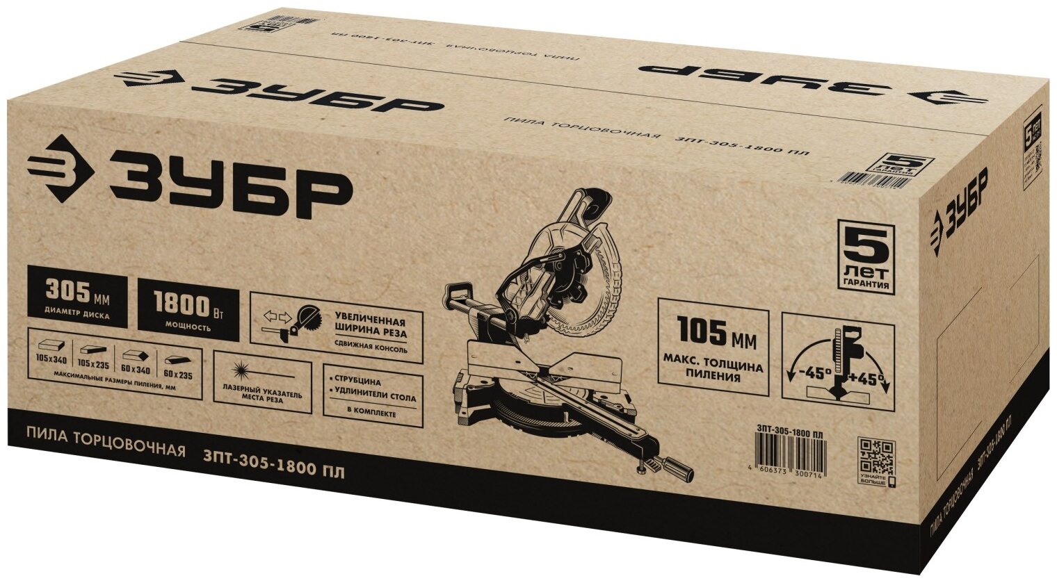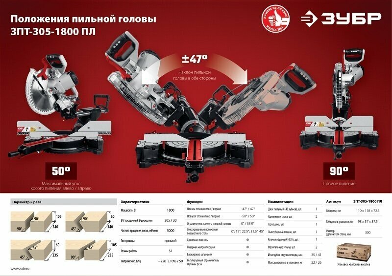 Type: miter saw, laser marker, disc diameter: 305 mm, Power W: 1800, cutting depth 90°: 105 mm, cutting width 90°: 340 mm, feed: mains, functions: spindle lock, laser marking, Bevel cut
