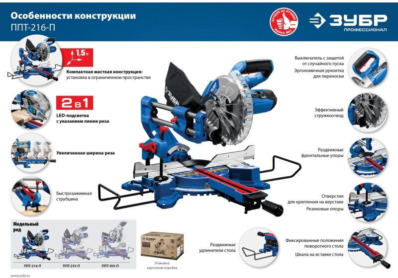 Description: Type: miter saw, laser marker, disc diameter: 216 mm, Power W: 1500, cutting depth 90°: 65 mm, cutting width 90°: 305 mm, with pull, power supply: from the mains, design features: the ability to connect a vacuum cleaner, laser �