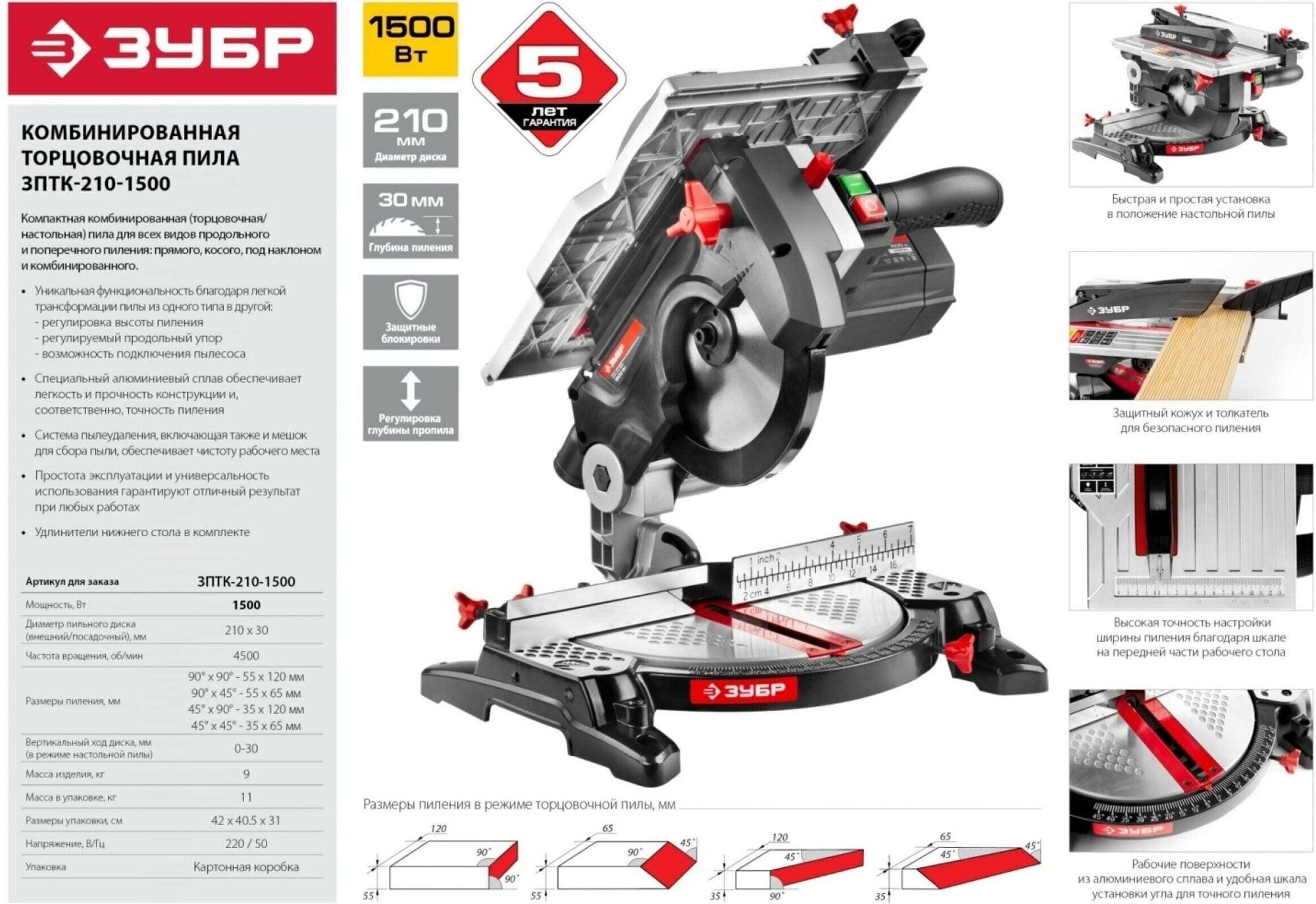 Advantages of ZUBR MASTER ZPTK-210-1500 Unique functionality due to easy transformation of the saw from one type to another; A complete set of all functions for each type of saw; Reliability and ease of use; Possibly