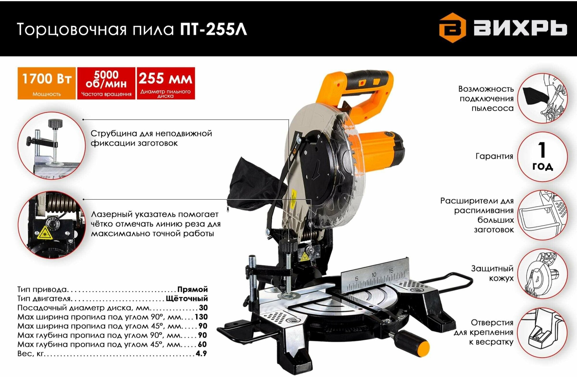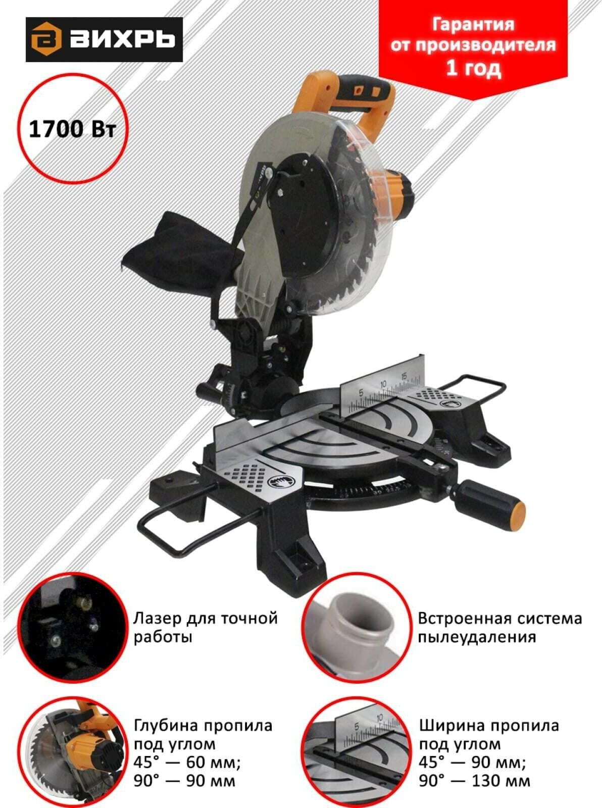 Type: miter saw, laser marker, disc diameter: 255 mm, Power W: 1700, cutting depth 90°: 90 mm, cutting width 90°: 130 mm, power supply: from the mains, functions: Safety lock, Spindle lock, Laser once