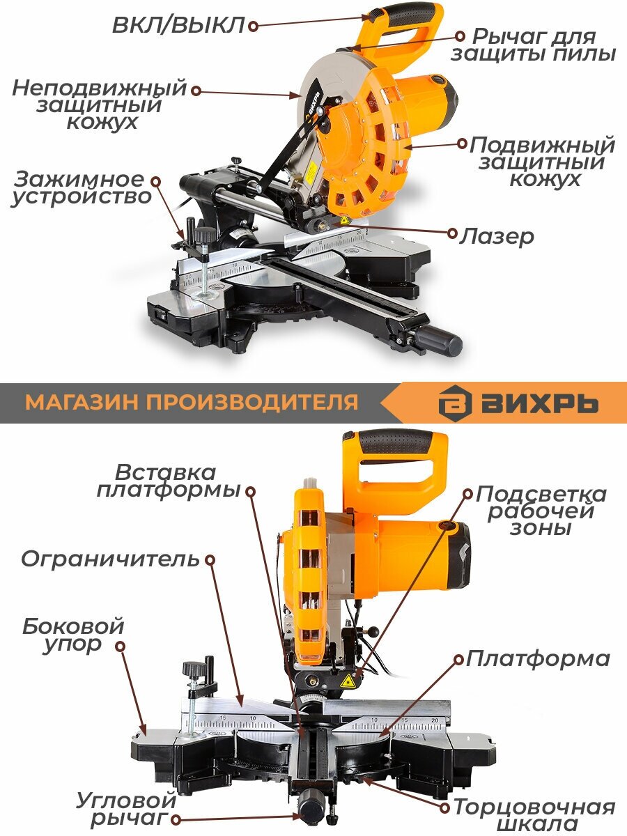 Contents of delivery: Miter saw, clamping device, side stop - 2 pcs., dust bag, keys - 2 pcs., passport, packaging
