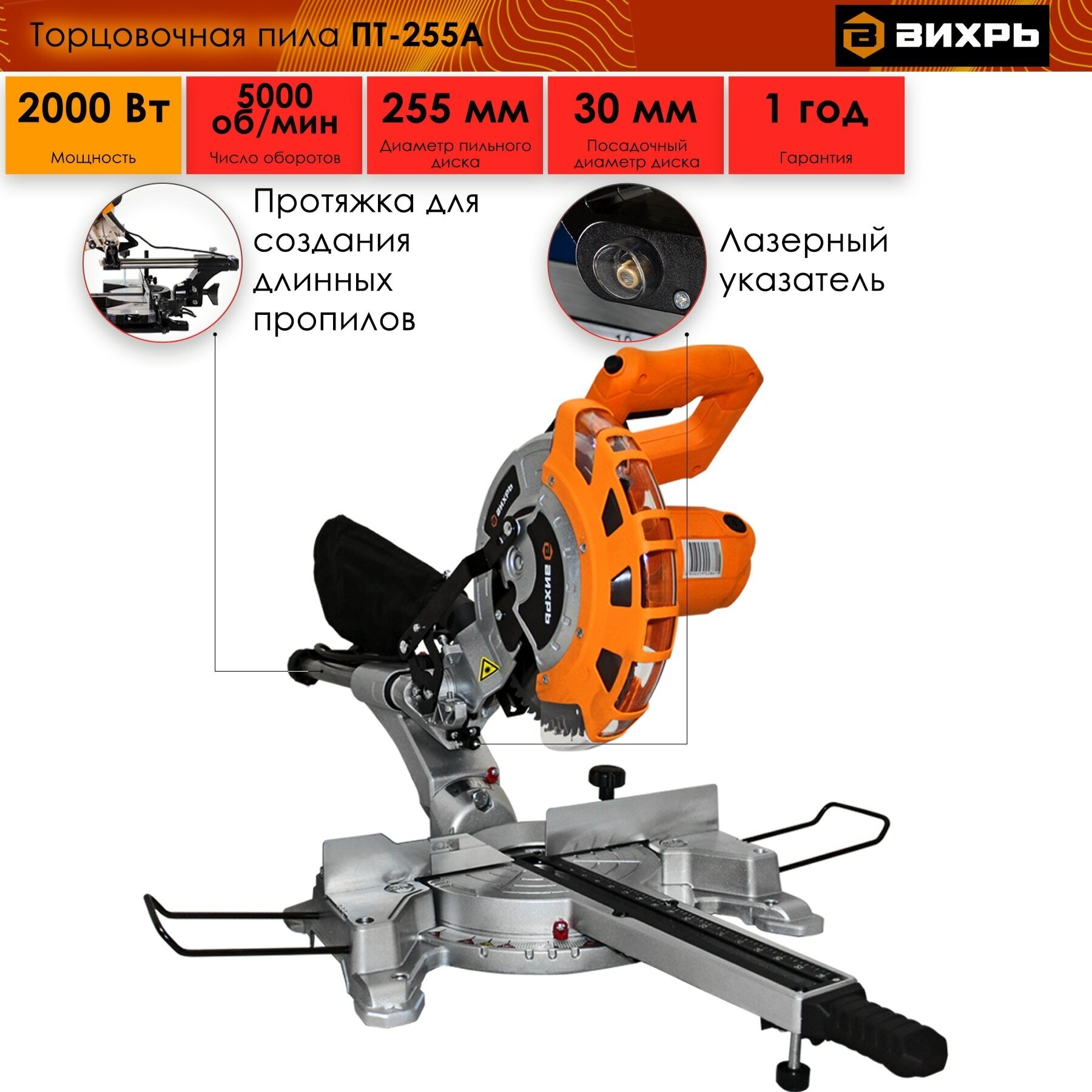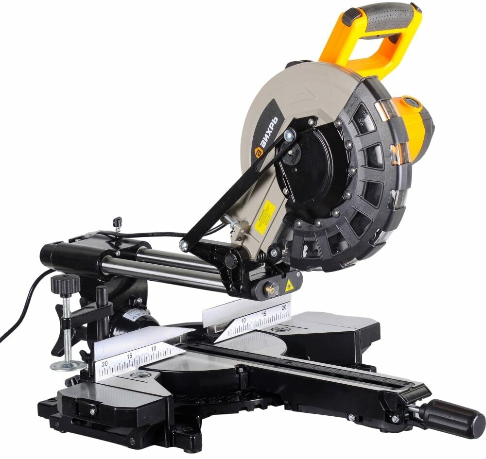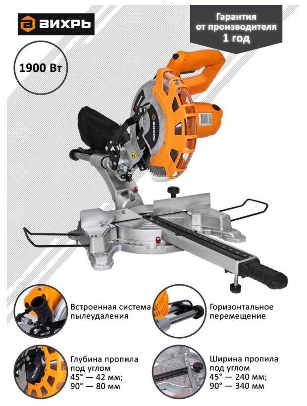 Type: miter saw, laser marker, disc diameter: 216 mm, Power W: 1500, cutting depth 90°: 65 mm, cutting width 90°: 305 mm, with pull, power supply: from the mains, design features: the ability to connect a vacuum cleaner, laser �