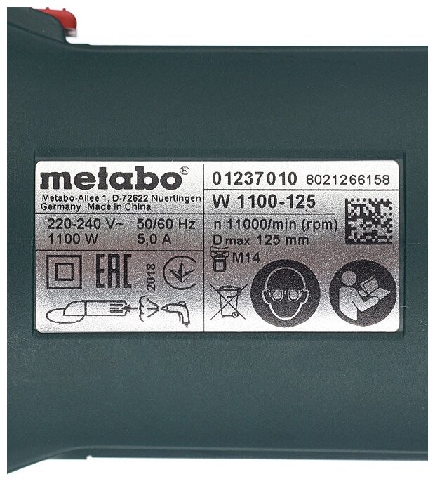 Type of power supply: mains, max. disc diameter: 125 mm, design features: power button lock, additional handle, spindle lock, power consumption: 1100 W, packaging: box, max. speed d