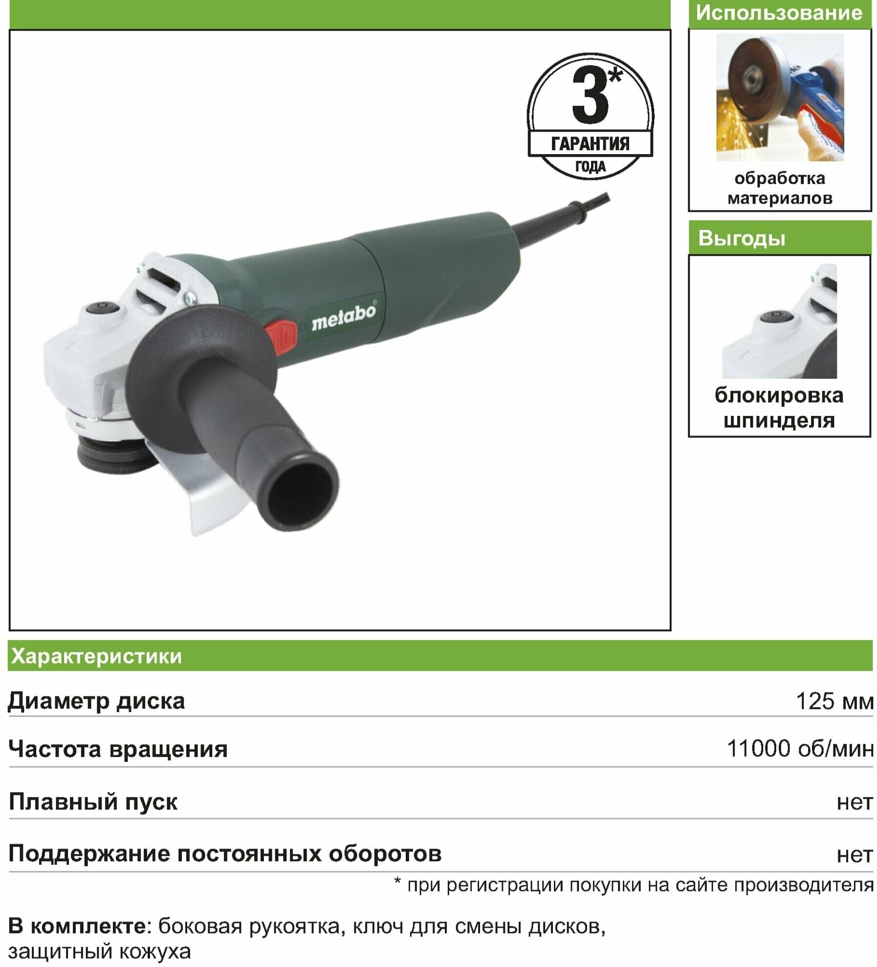 Type of power supply: mains, max. disc diameter: 125 mm, design features: power button lock, additional handle, spindle lock, power consumption: 1450 W, max. disk speed: 11000 rpm, weight