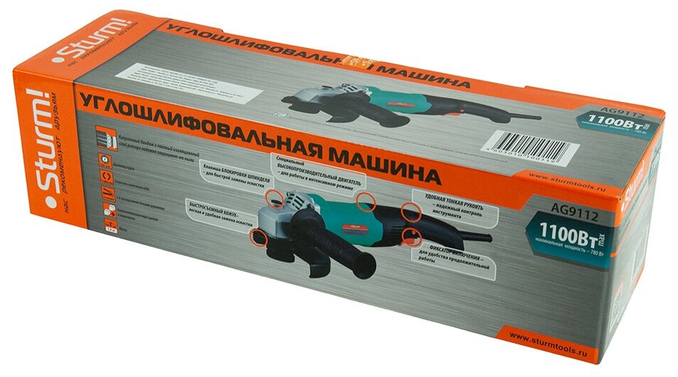 Description: Type of power supply: mains, max. disc diameter: 125 mm, design features: additional handle, spindle lock, power consumption: 1100 W, packaging: box, max. disk rotation speed: 11000 rpm, weight: 1.90 kg, number
