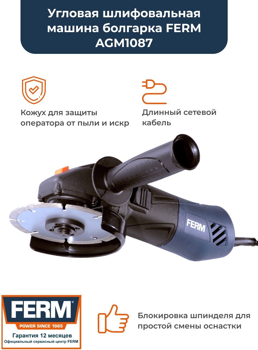Type of power supply: mains, max. disc diameter: 125 mm, design features: power button lock, additional handle, spindle lock, power consumption: 1450 W, max. disk speed: 11000 rpm, weight