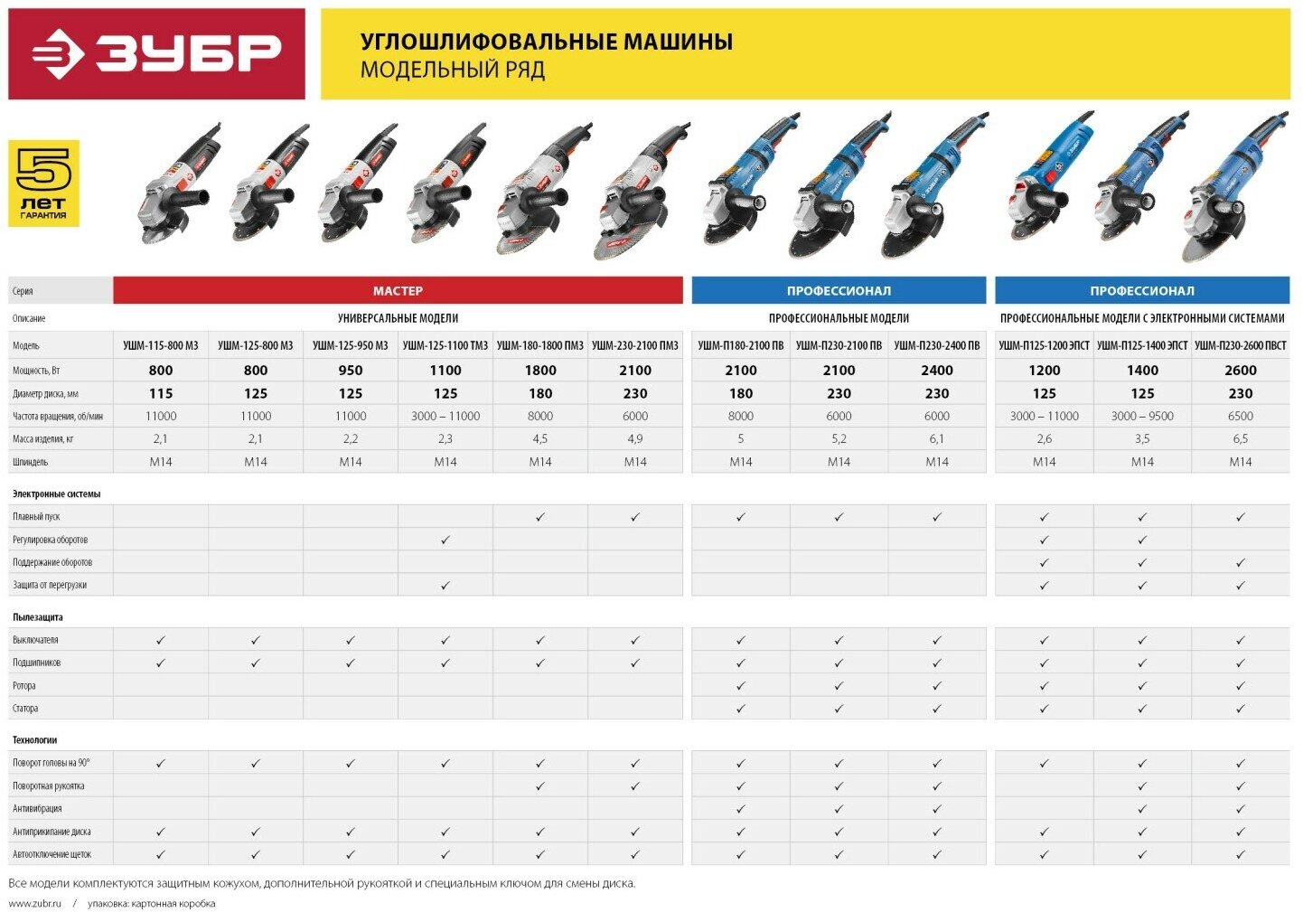 Type of power supply: mains, max. disc diameter: 125 mm, design features: power button lock, additional handle, spindle lock, Protective cover, Super flange, power consumption: 950 W, packaging: box