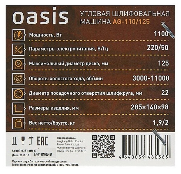 Type of power supply: mains, max. disc diameter: 125 mm, design features: power button lock, additional handle, spindle lock, power consumption: 1100 W, packaging: box, max. speed d