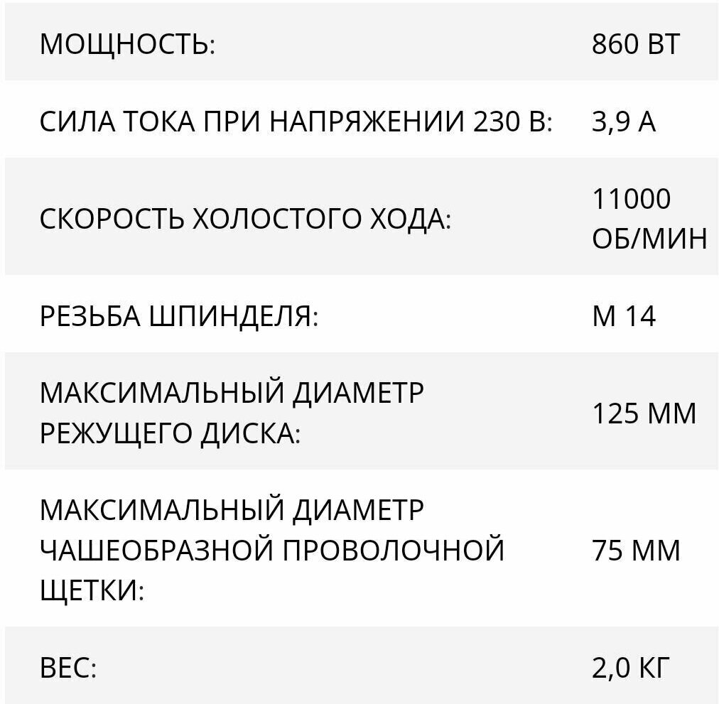 Type of power supply: mains, max. disc diameter: 125 mm, design features: power button lock, additional handle, spindle lock, power consumption: 1450 W, max. disk speed: 11000 rpm, weight
