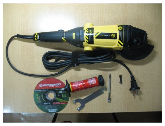 Description: Type of power supply: mains, max. disc diameter: 125 mm, design features: power button lock, additional handle, dust collector, spindle lock, power consumption: 1200 W, packaging: box, max. often