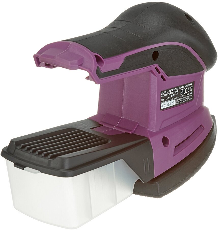 Power type: battery, design features: dust collector, packaging: box, battery voltage: 18V