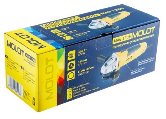 Type of power supply: mains, max. disc diameter: 125 mm, design features: power button lock, additional handle, spindle lock, power consumption: 600 W, max. disc speed: 11000 rpm, weight