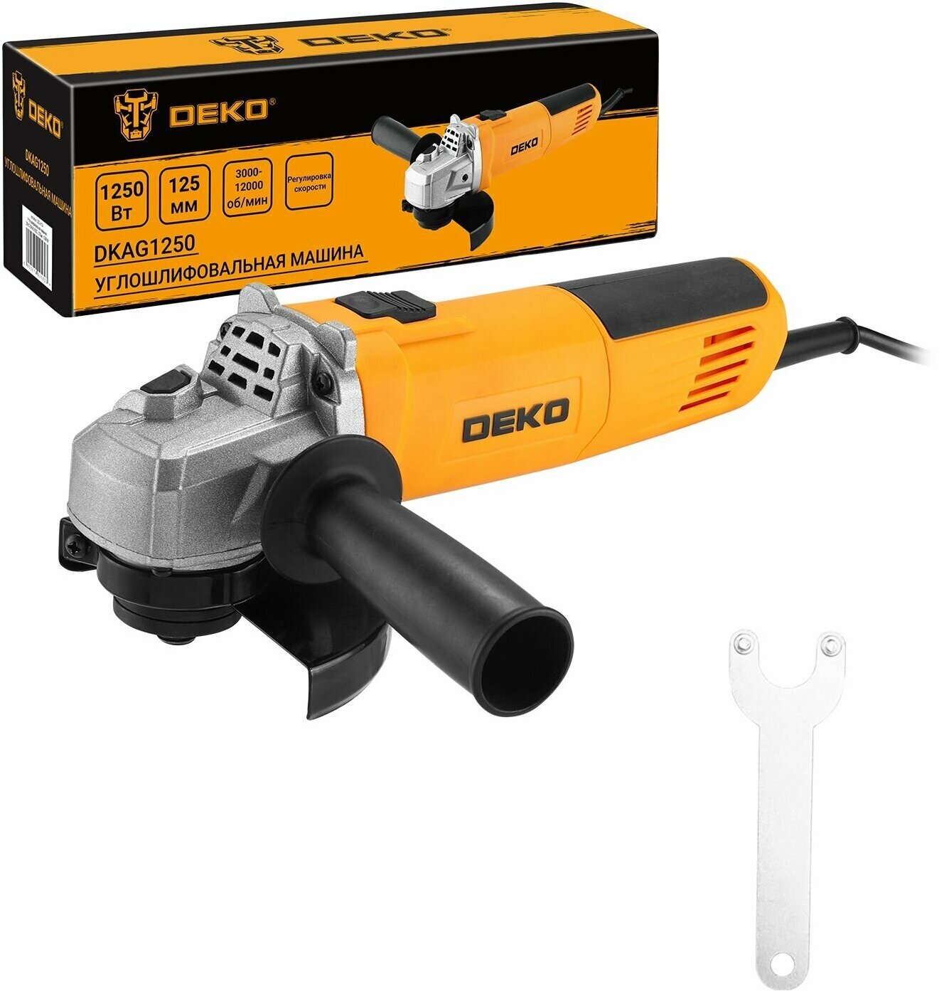 Type of power supply: mains, max. disc diameter: 125 mm, design features: additional handle, speed control, power consumption: 1250 W, packaging: box, max. disk rotation speed: 11000 rpm, ve