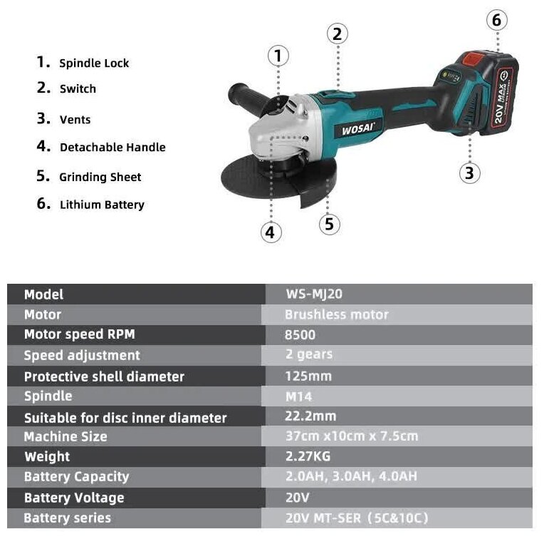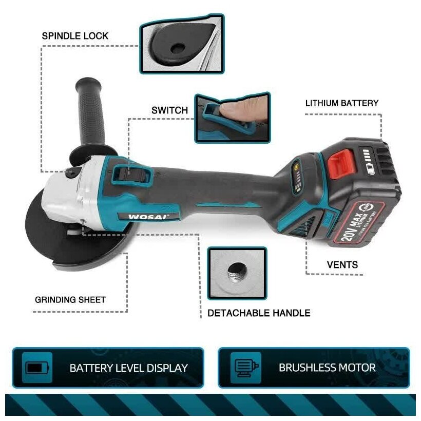 Cordless angle grinder Wosai 20V WS-J7-C1