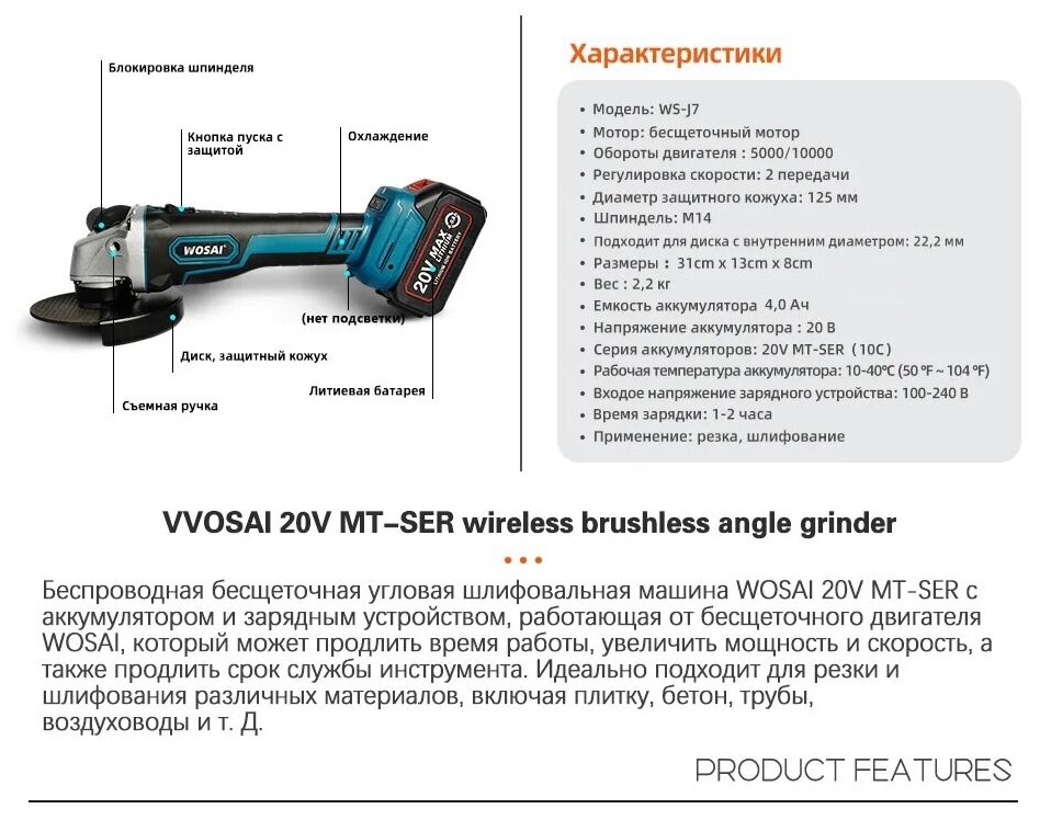Cordless angle grinder WOSAI 20V 4.0Ah WS-J7-B1 with bag