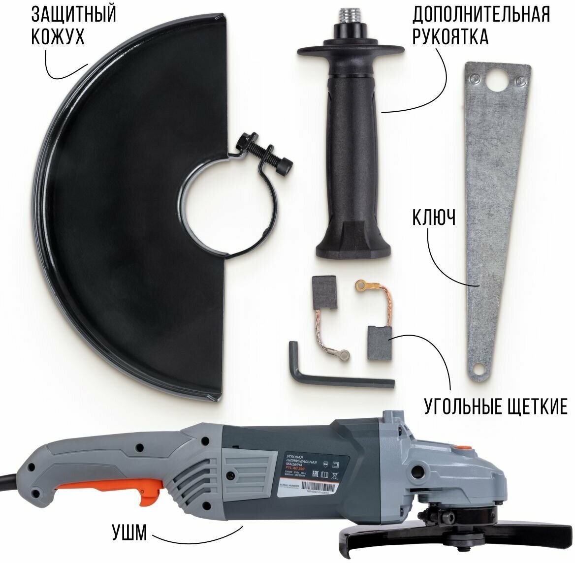 Type of power supply: mains, max. disc diameter: 230 mm, design features: additional handle, spindle lock, power consumption: 2500 W, packaging: box, max. disc rotation speed: 6000 rpm, weight: 5 kg, quantity