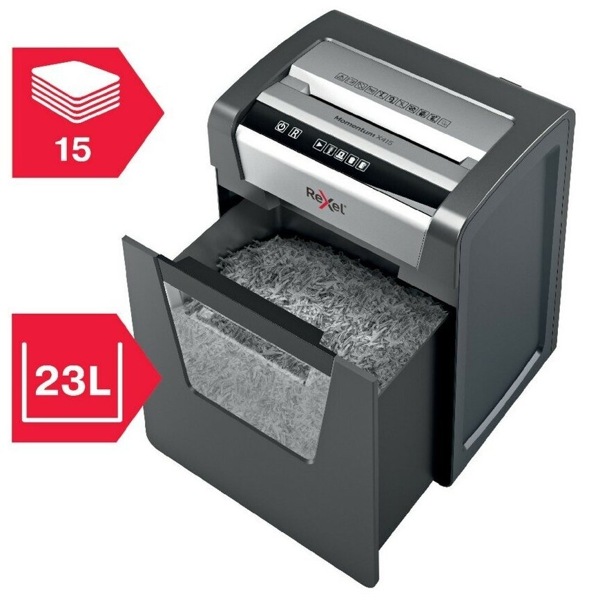 Shredder shredder REXEL MOMENTUM X415, 4 security level, fragments, 4x40 mm, 15 sheets, 23 sheets, 2104576EU, 1 pc.
