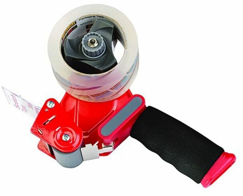 Case material - metal, handle - plastic; screw for adjusting the tape tension, built-in steel knife, pressure plate for continuous tape sticking; roll core diameter - 76.2 mm 3"